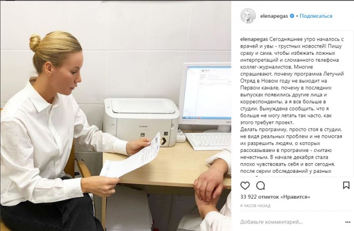 «Сегодняшнее утро началось с врачей и увы — грустных новостей! Пишу сразу и сама, чтобы избежать ложных интерпретаций и сломанного телефона коллег-журналистов. Многие спрашивают, почему в последних выпусках появились другие лица и корреспонденты, а я все больше в студии. Летать по 2−3 раза в неделю, как того требует программа, категорически запрещено! Никогда не думала, что размещу подобный пост, но сейчас я выбираю здоровье», — написала Летучая в Instagram.