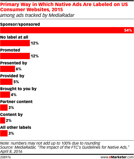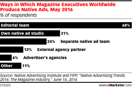 Компания Native Advertising Institute, специализирующаяся на разработке и консалтинге в области нативной рекламы, а также медиасеть FIPP, объединяющая медиакомпании и ассоциации, с апреля по май провели опрос первых лиц 140 изданий из 39 стран мира. Более 2/3 опрошенных респондентов сообщили, что нативную рекламу в их СМИ делает редакционный отдел.