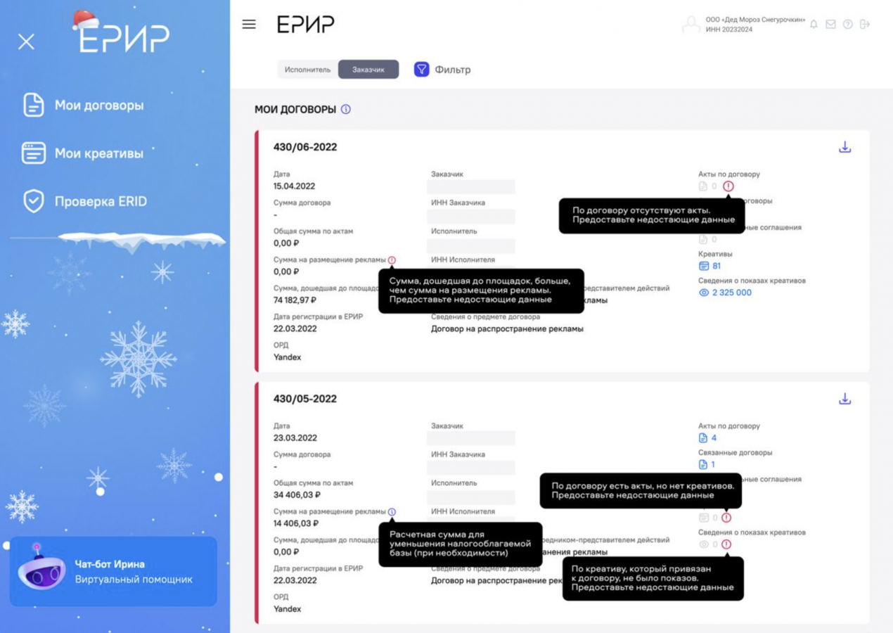 Как пояснили в ведомстве, теперь в разделе «Мои договоры» отображаются комментарии, помогающие понять, где допущены ошибки, и что нужно сделать, чтобы их исправить. «Подсвечиваются» поля «Сумма на размещение рекламы», «Акты по договору», «Креативы», «Сведения о показах креативов».