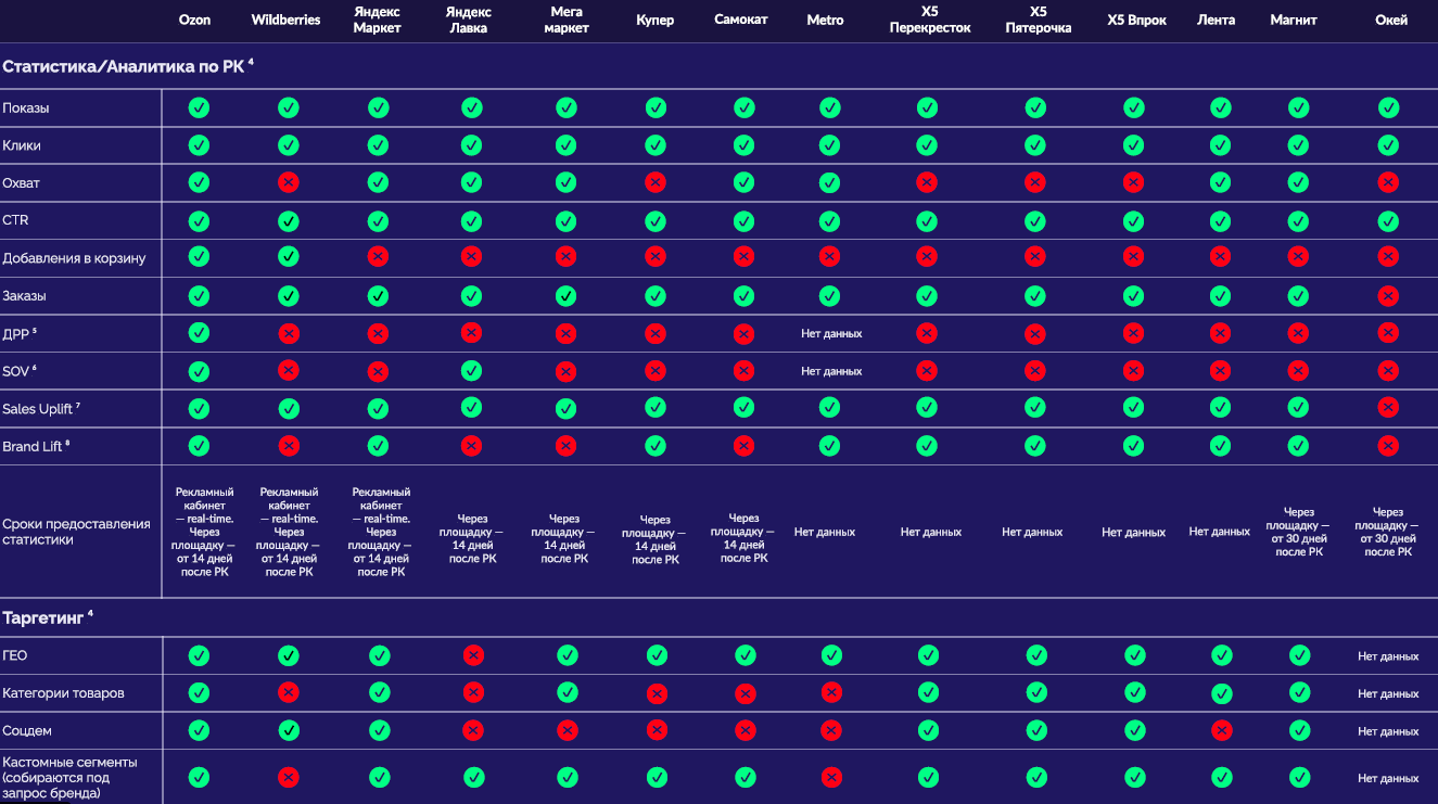 Таргетинг. Наиболее полный спектр таргетингов для обеспечения персонализированной коммуникации с покупателями предоставляют Ozon, «Яндекс Маркет», «Магнит» и X5 Group. Эти площадки собирают, сегментируют и управляют пользовательскими данными, что дает возможность таргетироваться по гео, категориям товаров, соцдем характеристикам, а также собирать кастомные сегменты по запросу рекламодателей.