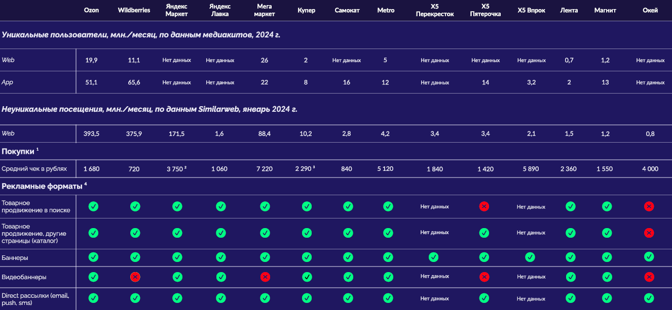 Среди 35 анализируемых параметров: объем посетителей сайтов и приложений, средний чек, возможности таргетинга, модели закупки рекламы, метрики эффективности кампаний. Сравнительная таблица, подготовленная на основе полученной информации, поможет рекламодателям сделать выбор при размещении рекламных кампаний. Сбор данных проводился на основе официальных медиакитов онлайн-ритейлеров, опубликованных исследований и других открытых источников.