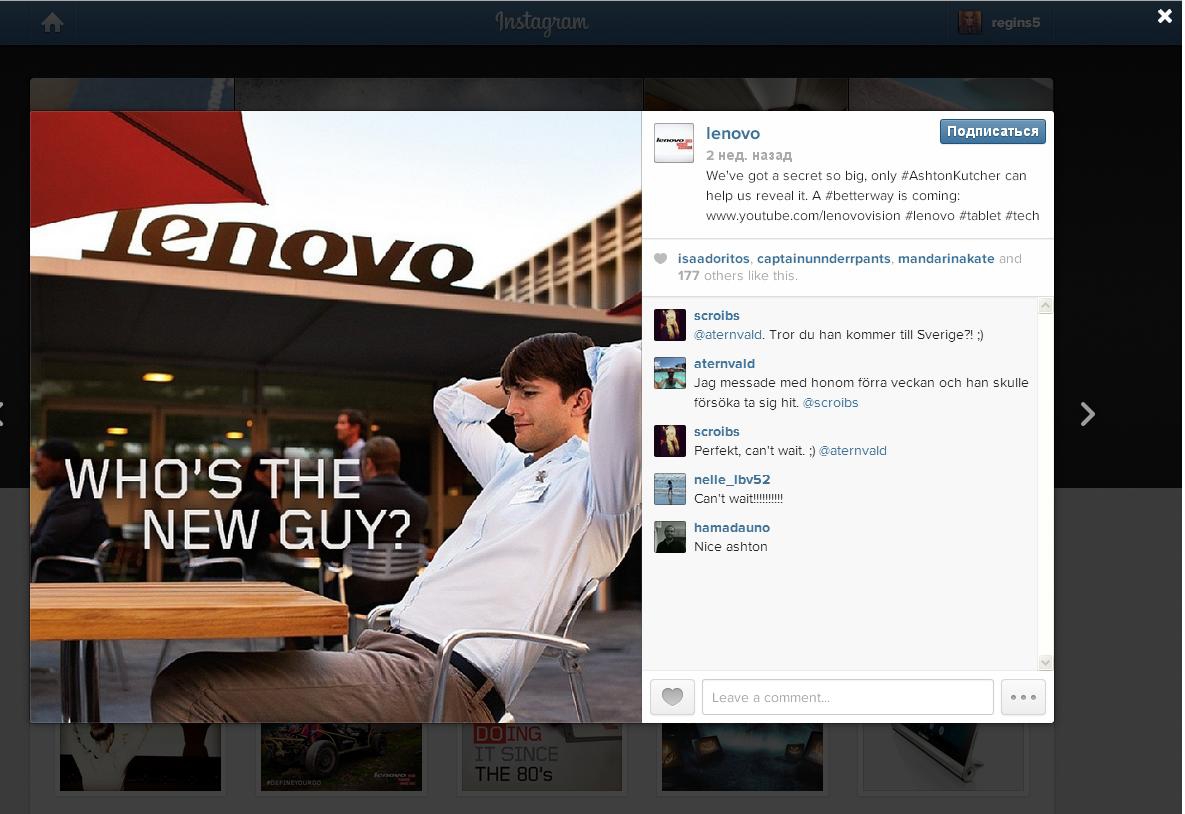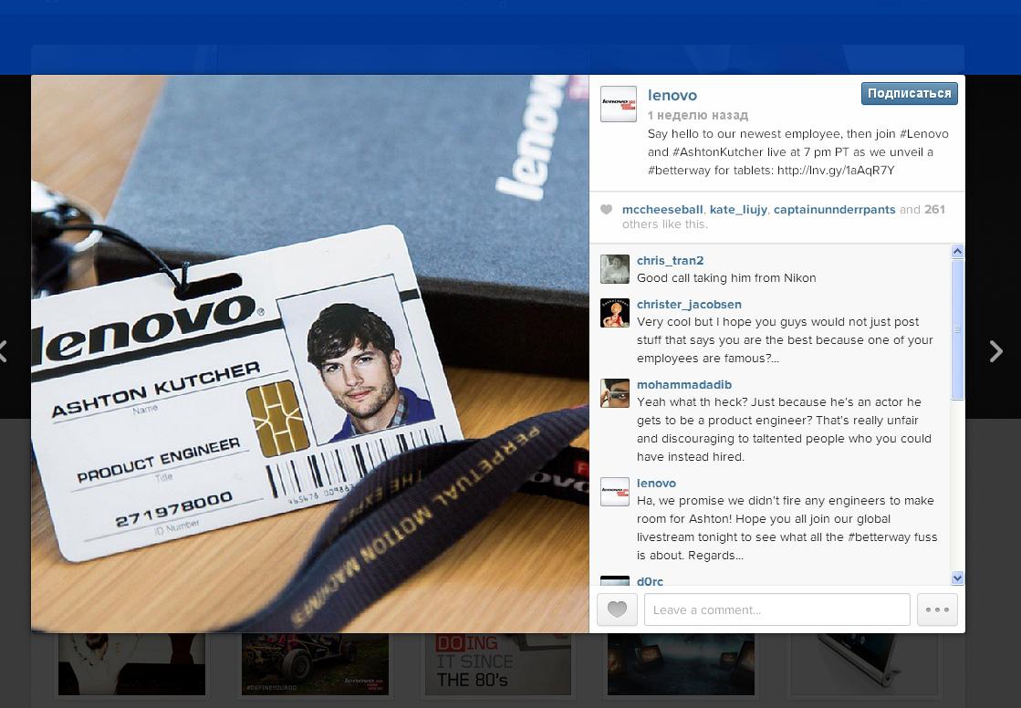 В свою очередь, в Твиттере Lenovo появились фотографии актера в окружении логотипа Lenovo, а также снимок бейджа Кутчера с должностью инженера-разработчика.