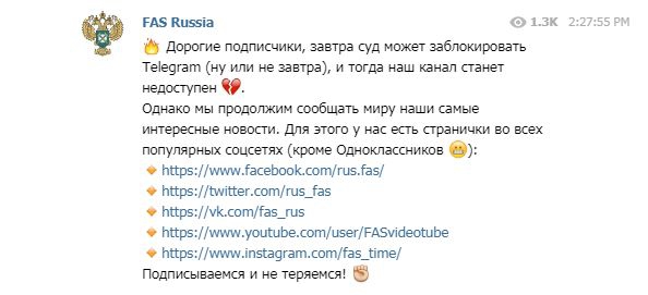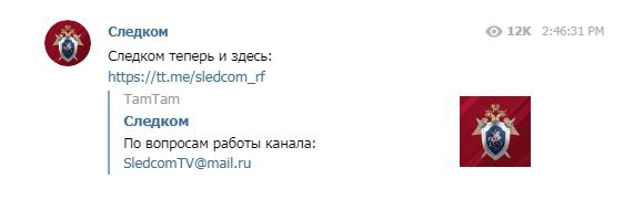 Федеральная антимонопольная служба (ФАС) России призвала подписчиков «подписываться и не теряться» на странички в Facebook, Twitter и «ВКонтакте». Следственный комитет России (СКР) анонсировал запуск канала в мессенджере «ТамТам», принадлежащего Mail.Ru Group.