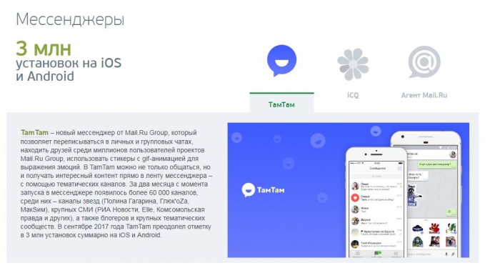 В сентябре 2017 года «ТамТам» преодолел отметку в 3 млн установок суммарно на iOS и Android. Каналы в мессенджере завели Полина Гагарина, Глюк'oZa, МакSим, а также СМИ (РИА Новости, Elle, «Комсомольская правда»), блогеры и крупные тематические сообщества. А уже в начале апреля Mail.Ru Group зафиксировала двукратный рост числа регистраций пользователей в «ТамТам». За неделю просмотры публикаций в каналах выросли в четыре раза, и только за два дня пользователи создали более 30 тысяч новых каналов.