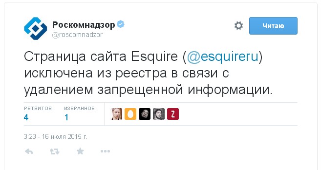 Роскомнадзор исключил сайт журнала Esquire из реестра запрещенных сайтов. Это следует из сообщения, опубликованном на официальной странице Роскомнадзора в twitter.