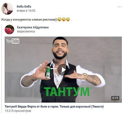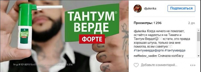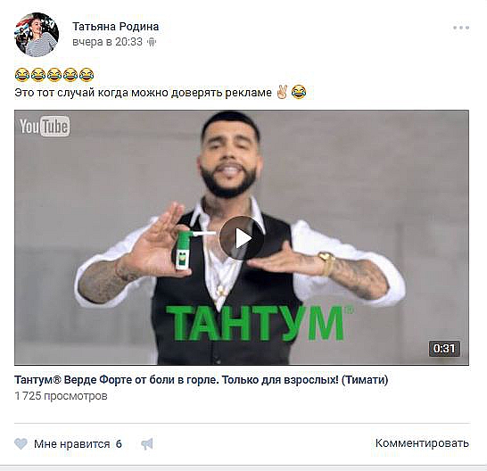 Другой свежий пример — фармацевтический рэп от Тимати для «Тантум Верде Форте». Стартовав в середине сентября на YouTube ролик набрал пол-миллиона просмотров меньше, чем за месяц и стал одним из самых популярных рекламных роликов на российском YouTube.