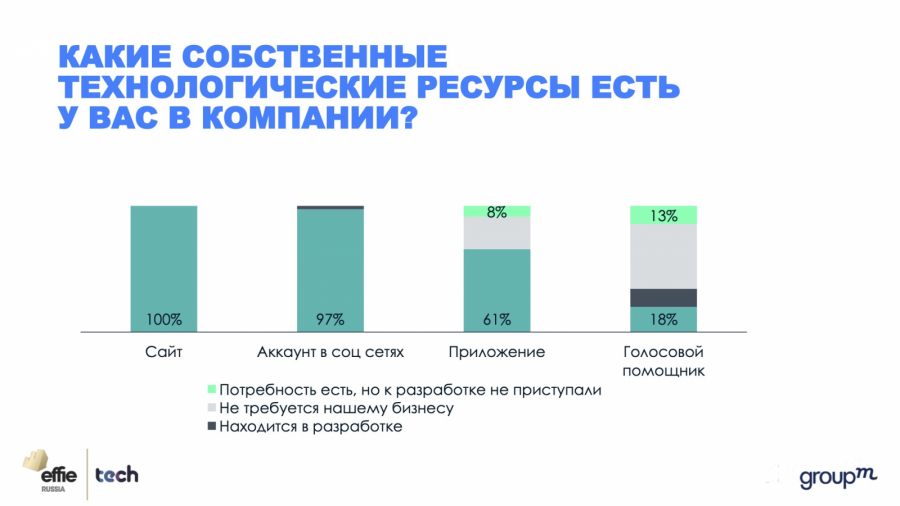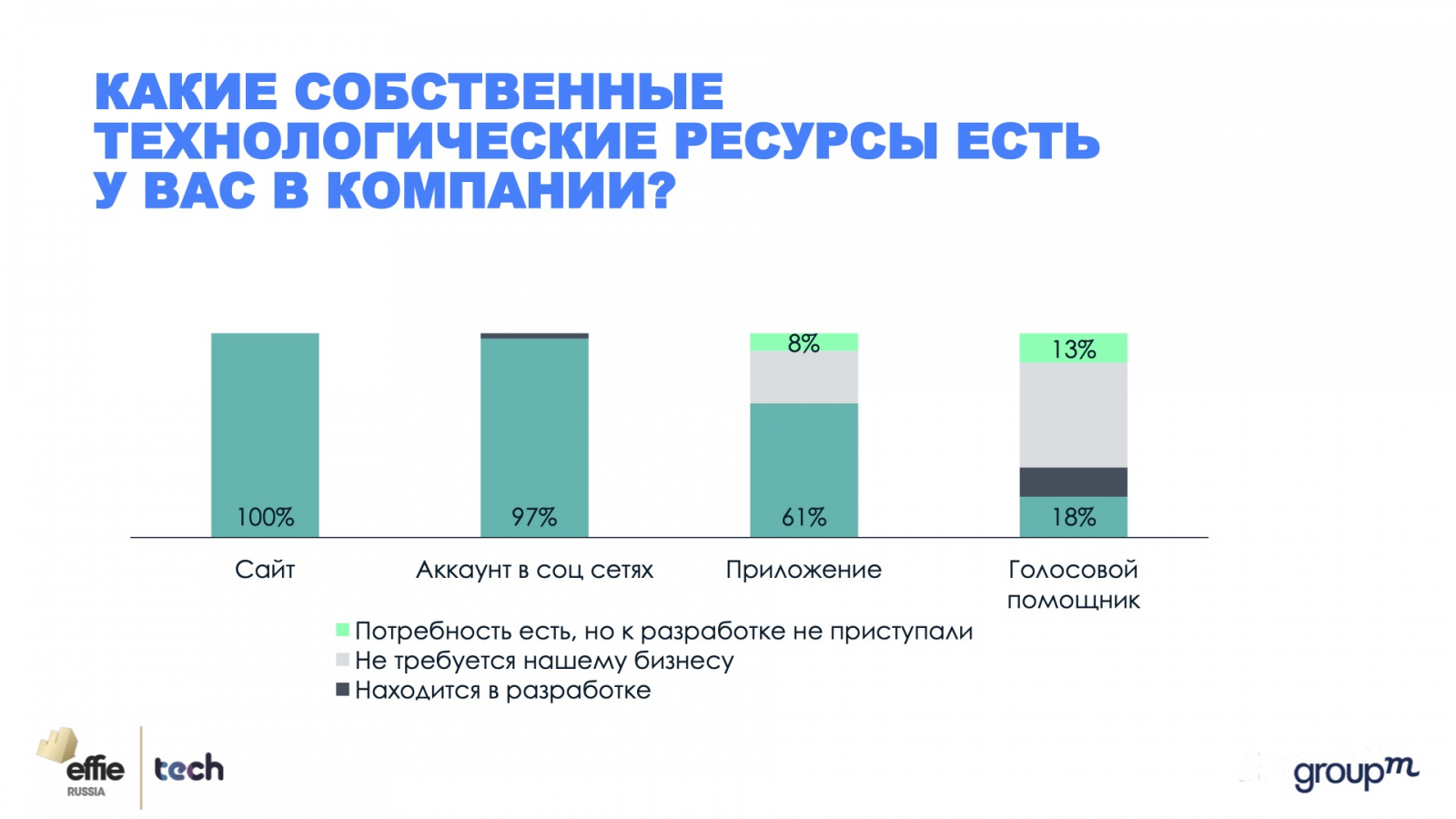 У российских компаний разная степень использования собственных технологических ресурсов в области маркетинга. Значительная часть бизнесов испытывает потребность в собственных мобильных приложениях или чат-ботах, голосовых помощниках, но еще не приступала к разработке.