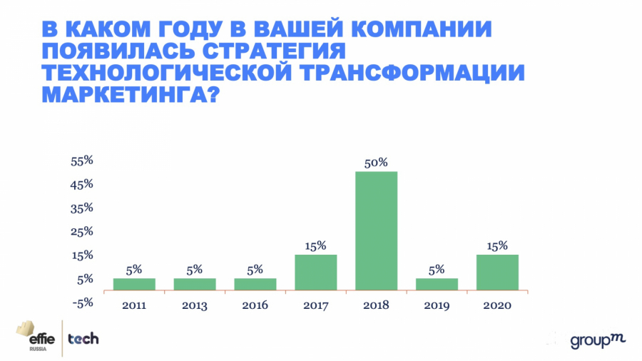 Согласно полученным данным, только у половины российских компаний есть стратегия технологической трансформации в области маркетинга. Большинство из них определи ее три-четыре года назад. При этом для 15% организаций катализатором изменений стали события 2020 года.