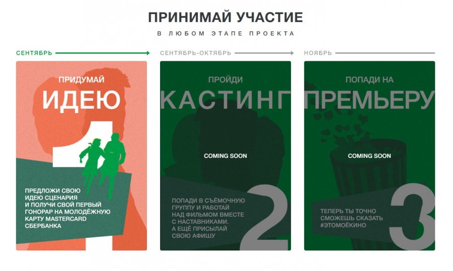 Короткометражки ограничены жанровым форматом, можно предлагать идеи для комедии, мелодрамы или же фантастики. Для того чтобы принять участие в конкурсе сценариев, надо быть держателем Молодежной карты MasterCard. Сбор заявок закончится 15 сентября. На втором этапе будет проводиться набор команды, и здесь к проекту смогут присоединиться те, кто захочет попробовать себя в качестве помощников режиссера, актеров, операторов, гримеров, художников. Уверенным в своем таланте соискателям достаточно будет лишь загрузить свое резюме на сайт проекта.