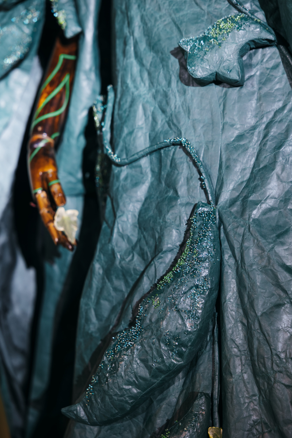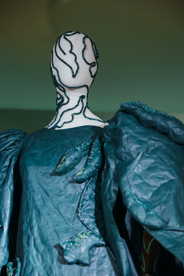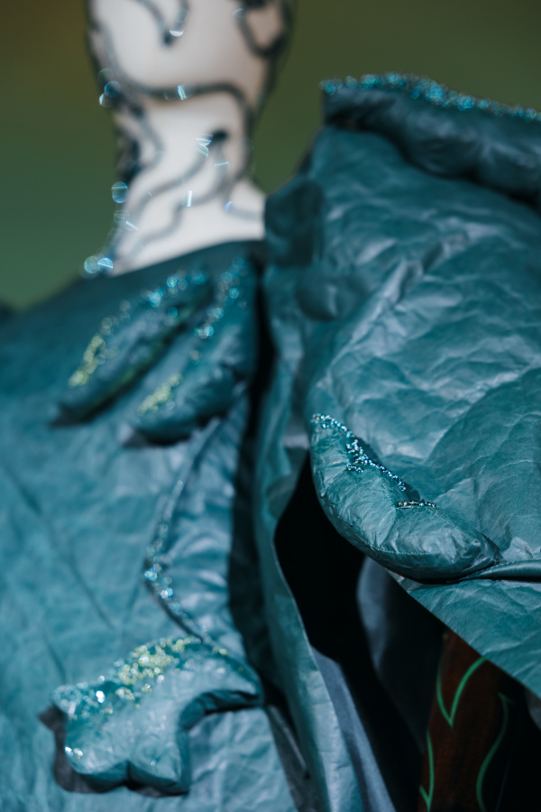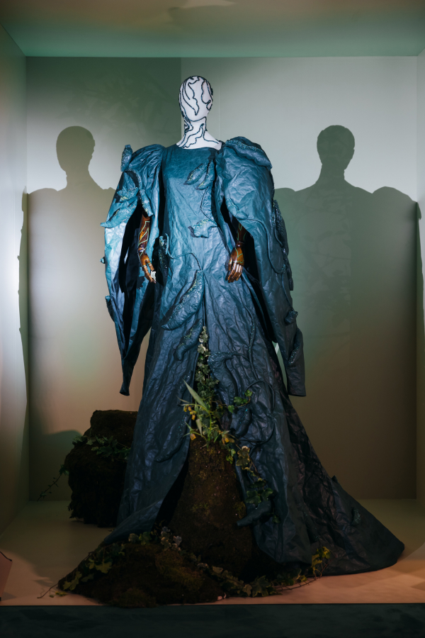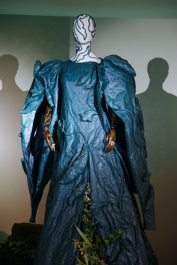 Платье с символичным названием «Волшебный лес» отсылает к образу русского народного костюма с длинными пышными рукавами и тонким силуэтом. Все швы выполнены в органичной, биоморфной эстетике — без прямых линий, словно повторяя пластику растительных форм. На контрасте с современной архитектурной пластикой тайвека, платье украшено объемными 3D-листьями, выполненными в кутюрной ручной технике.