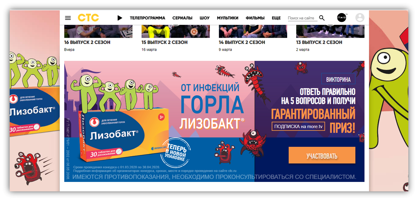За ответы на несколько вопросов о проектах СТС и о «Лизобакте» пользователи получали гарантированный подарок — подписку на сервис more.tv. Это позволило бренду не только привлечь дополнительное внимание к ярким образам, созданным в ТВ-эфире, но и подчеркнуть особенности продукта в нативном ключе.