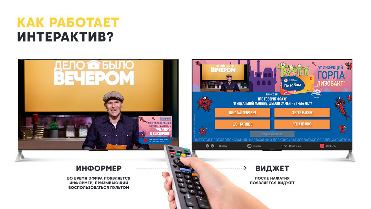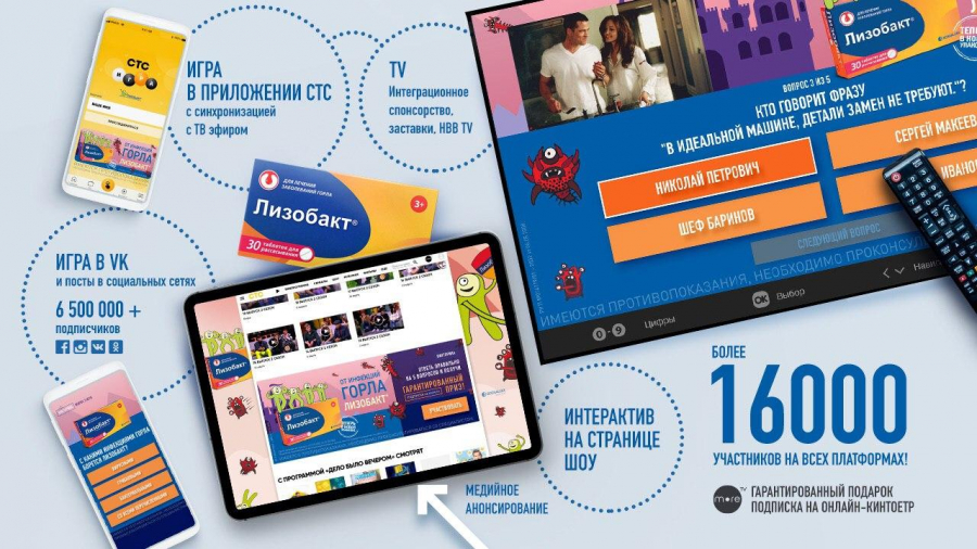 Пространством ТВ-эфира лизоцимы не ограничились — и с успехом выстроили взаимодействие со зрителями шоу в digital-среде. Ключевой составляющей digital-части проекта стала интерактивная викторина, в которой зрители примерили на себя роль участников шоу, а бренд «Лизобакт» рассказал о своем продукте.