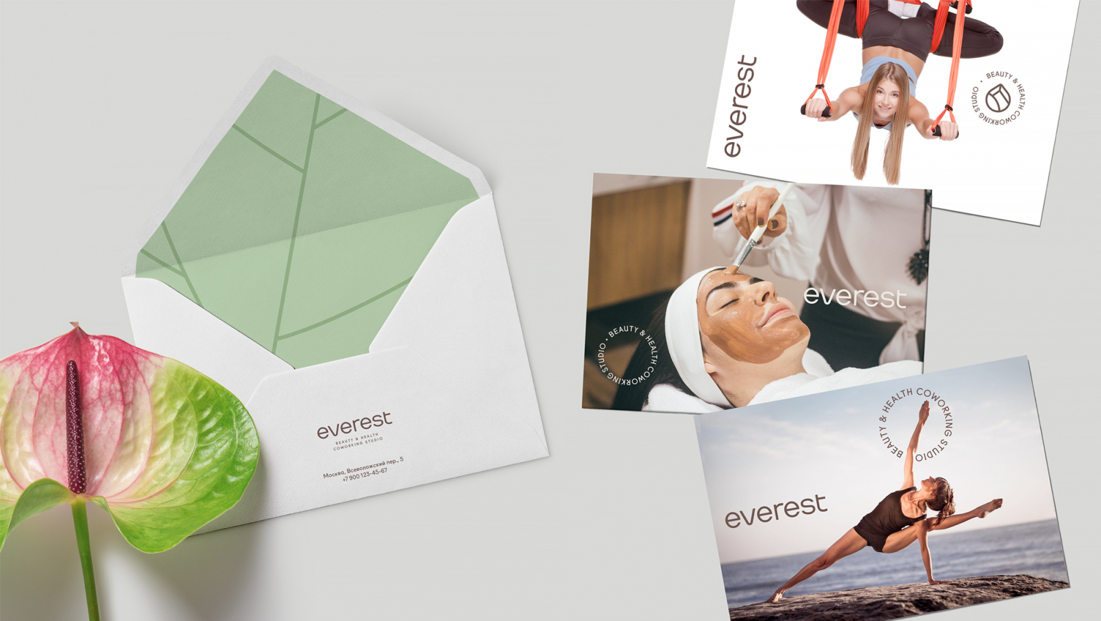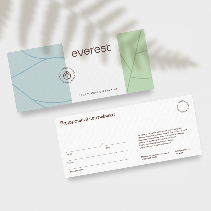 Первым этапом проекта стала разработка звучного и понятного нейма, который должен был донести умиротворенный и заботливый характер бренда, его «экологичность», возможность реализовать ресурсы тела и получить внутренний покой. Мы предложили Everest как словосочетание из Eve («женщина») и Rest («отдых», «момент расслабления», «покой»). Нейминг подчеркнул ключевую идею и духовную составляющую проекта.