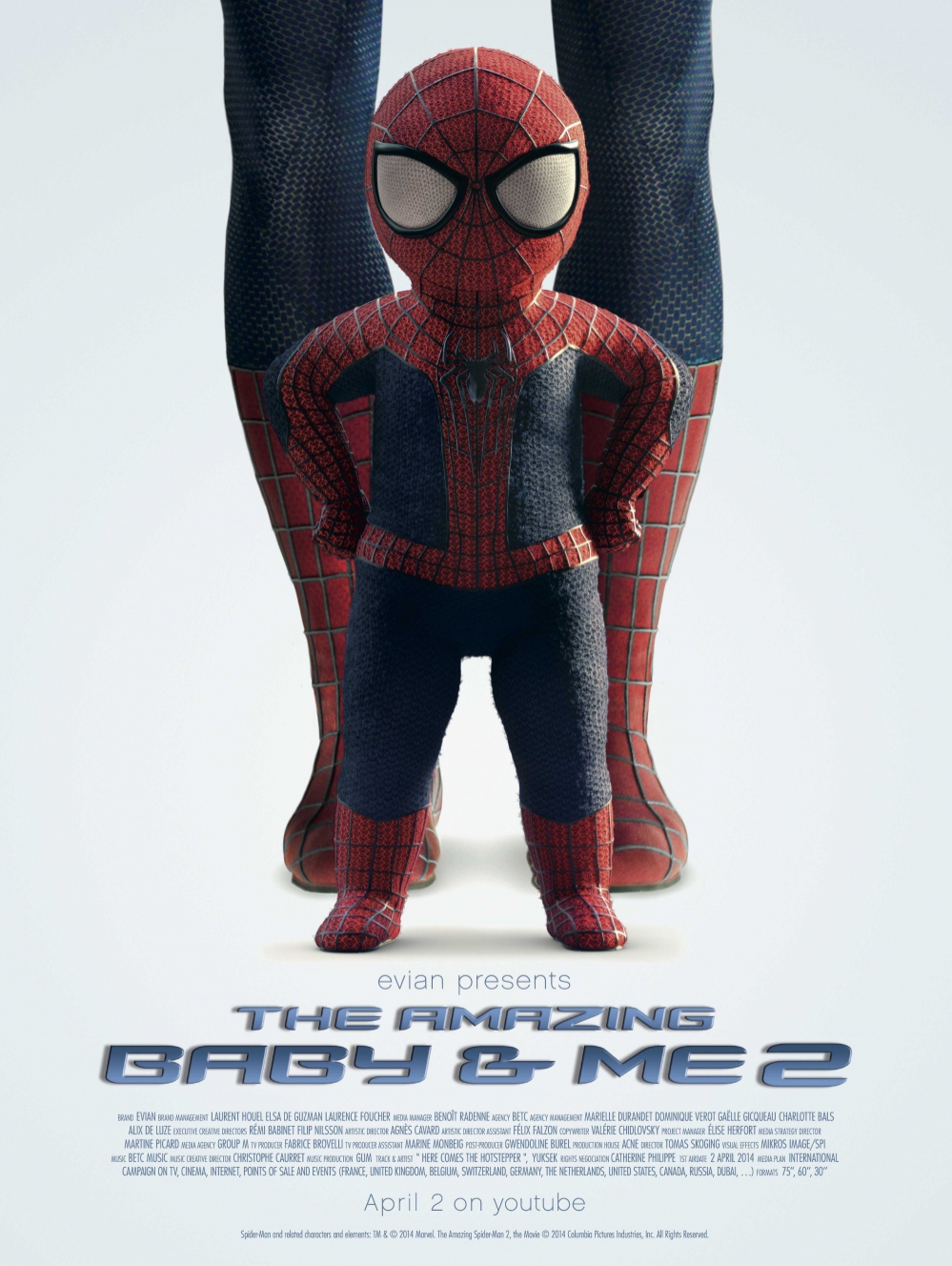 Бренд минеральной воды Еvian и креативное агентство BETC сняли продолжение нашумевшей рекламной кампании «Baby&me», приуроченное к выходу на большой экран сиквела супергеройского хита «The Amazing Spiderman» («Новый Человек-Паук» в российском прокате).