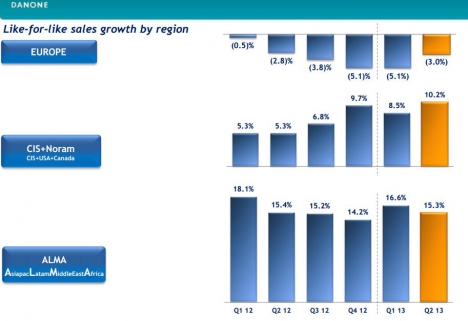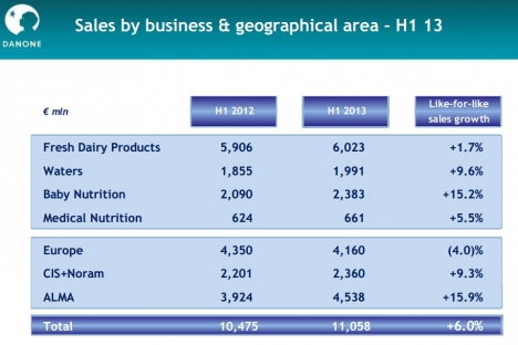 Французская компания Danone представила финансовые результаты за первое полугодие и II квартал 2013 года. Продажи Danone увеличились на 5,6% и составили 11,06 млрд евро, сопоставимые продажи выросли на 6%.
