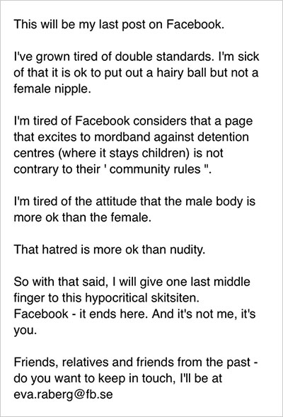 Устав от своей напрасной борьбы и от того, что Facebook не считает неприемлемыми страницы, на которых призывают жечь лагеря для беженцев, Ева решила удалить свою страницу в сети. И заодно заявить о своем неприятии цензурной политики Facebook: Ева разместиоа с соцсети фото с обнаженной грудью и обвинения Facebook в двойных стандартах.