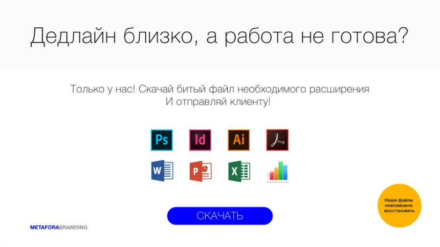Другой пример — реклама вымышленного сервиса, предлагавшего скачать битые файлы любого расширения, чтобы отправить их заказчику и выиграть время после просроченного дедлайна. После фестиваля в сети появились реальные сайты с похожим функционалом.