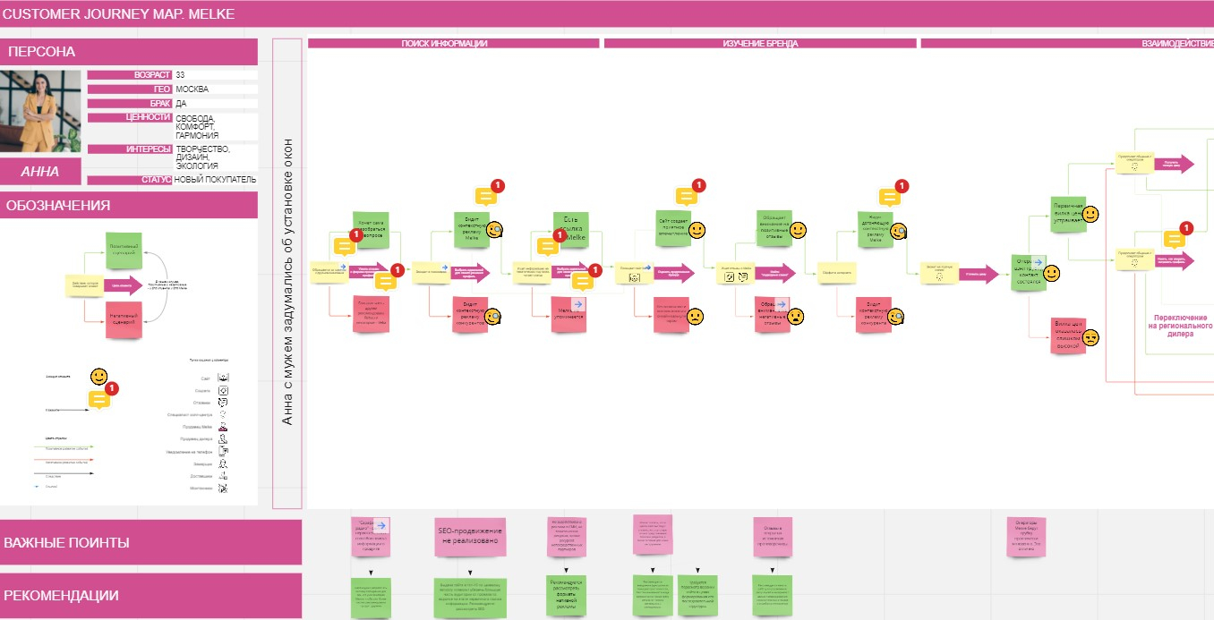 Фокусировка на мотивах выбора окон потребителями стала главным триггером в разработке коммуникационной платформы. Агентство отправило «тайных покупателей» в несколько торговых точек Москвы и регионов, а также проработало Customer Journey Map (CJM, таблица или типографика, показывающая все точки взаимодействия клиента и компании с самого первого прикосновения — прим. Sostav).