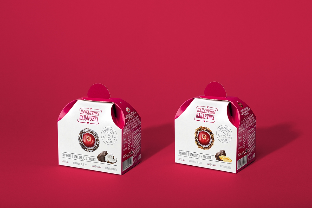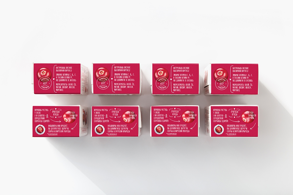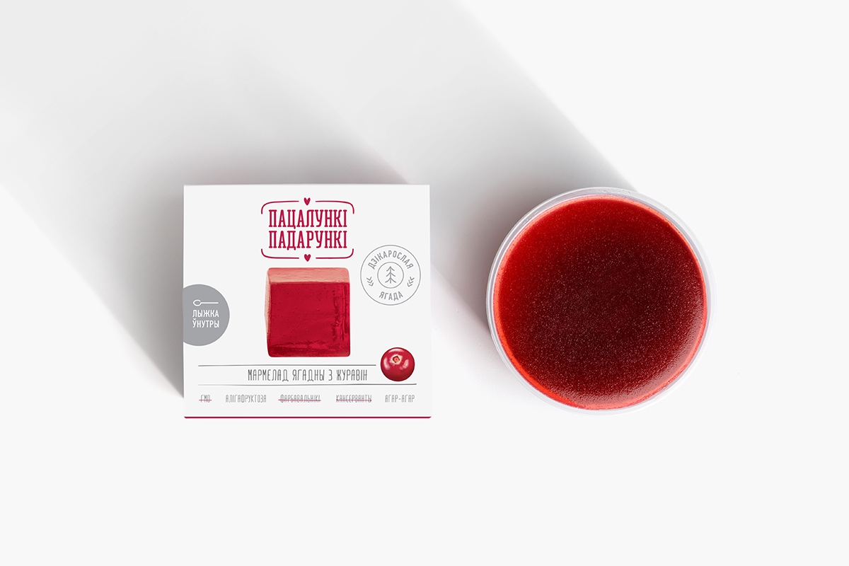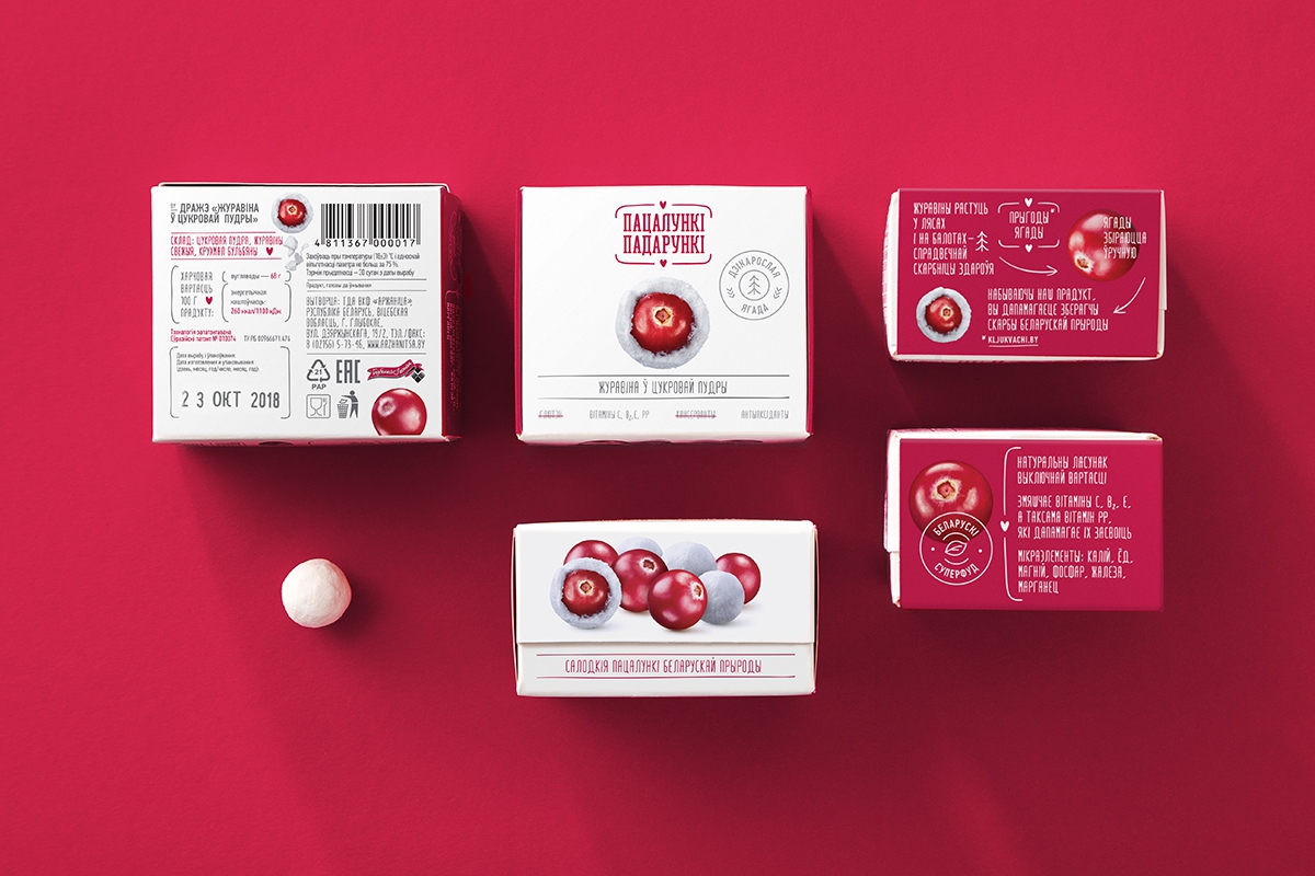 Естественно, коммуникация для такого продукта создавалась на белорусском языке. Она начинается с нейма «Пацалункі-падарункі», который уже рассказывает о ценности клюквы как подарка леса, созданного с любовью. Нейм не только ритмичен, но и визуально гармоничен благодаря сходному написанию слов. Его поддерживают УТП, показывающие пользу и натуральность продукта.