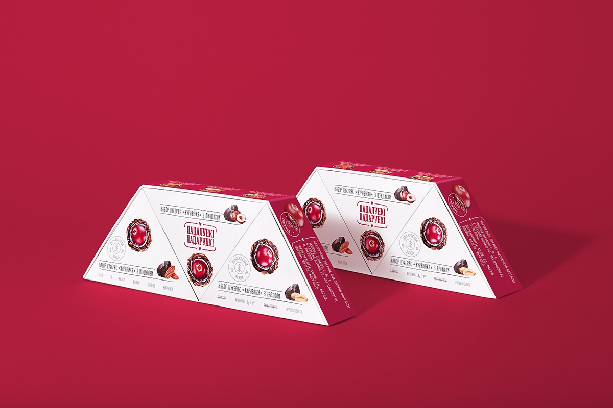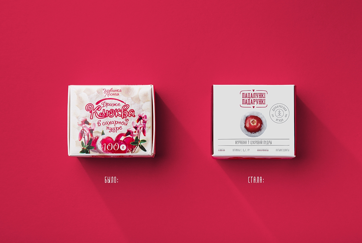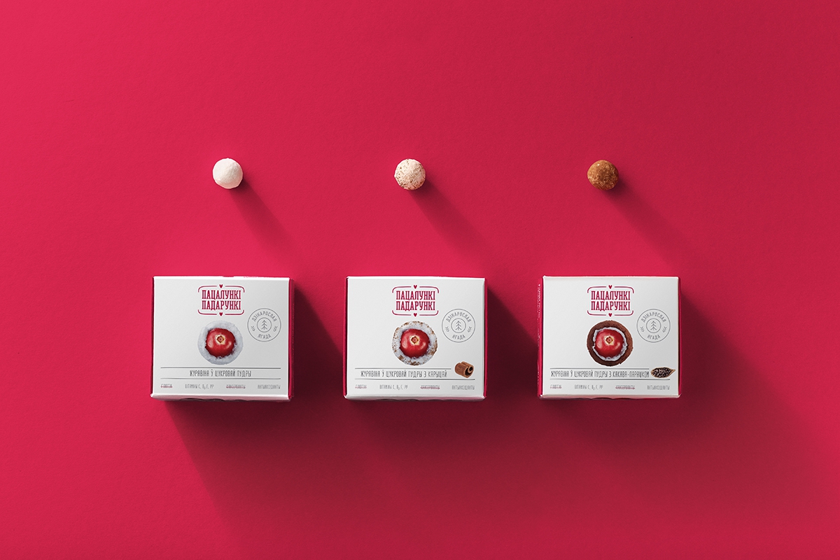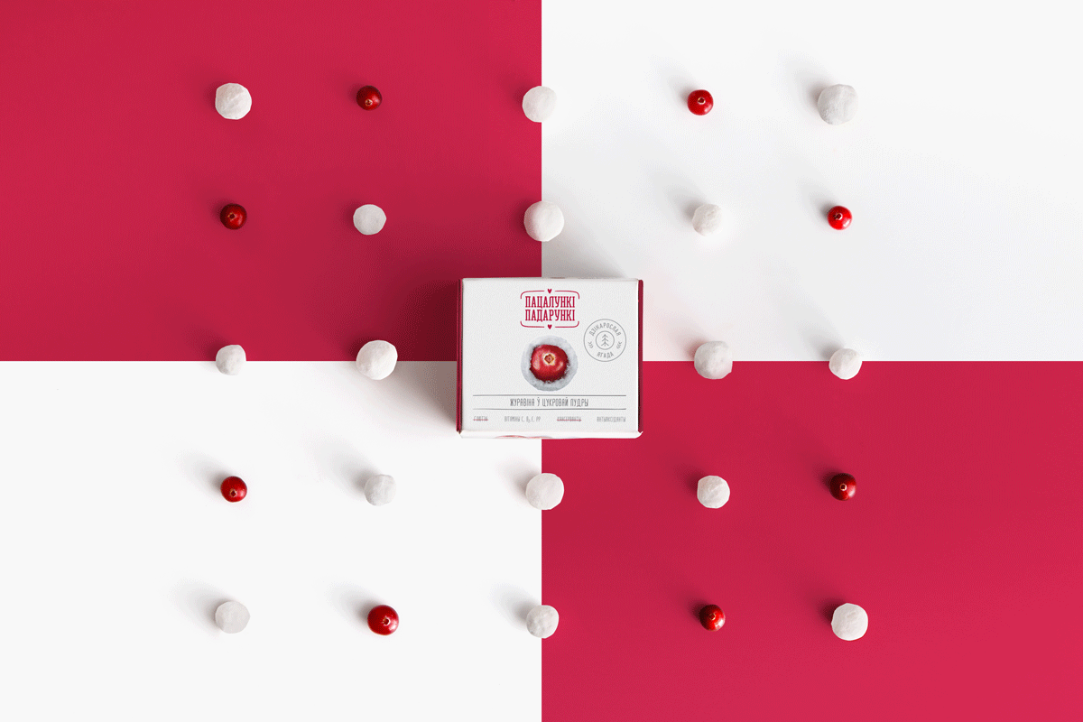 Естественно, коммуникация для такого продукта создавалась на белорусском языке. Она начинается с нейма «Пацалункі-падарункі», который уже рассказывает о ценности клюквы как подарка леса, созданного с любовью. Нейм не только ритмичен, но и визуально гармоничен благодаря сходному написанию слов. Его поддерживают УТП, показывающие пользу и натуральность продукта.