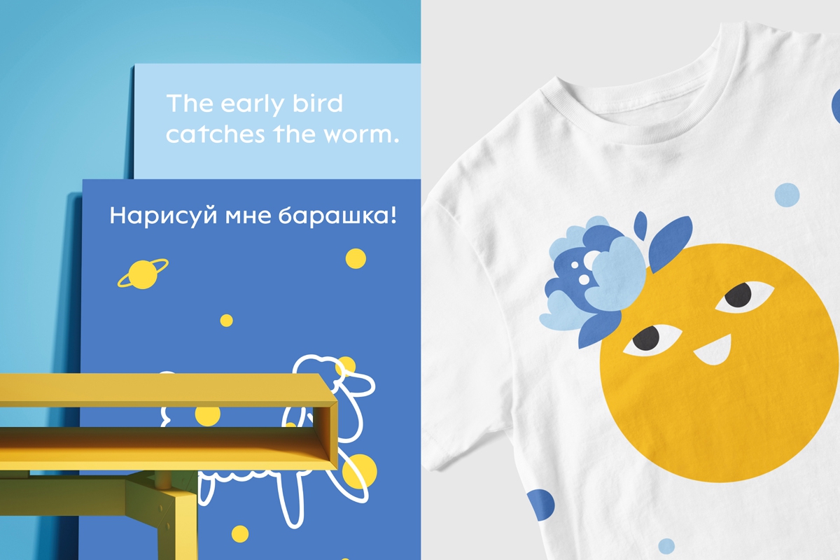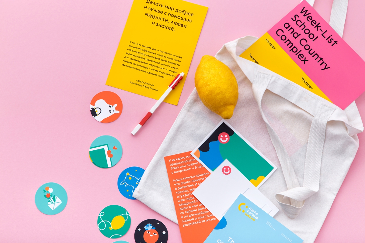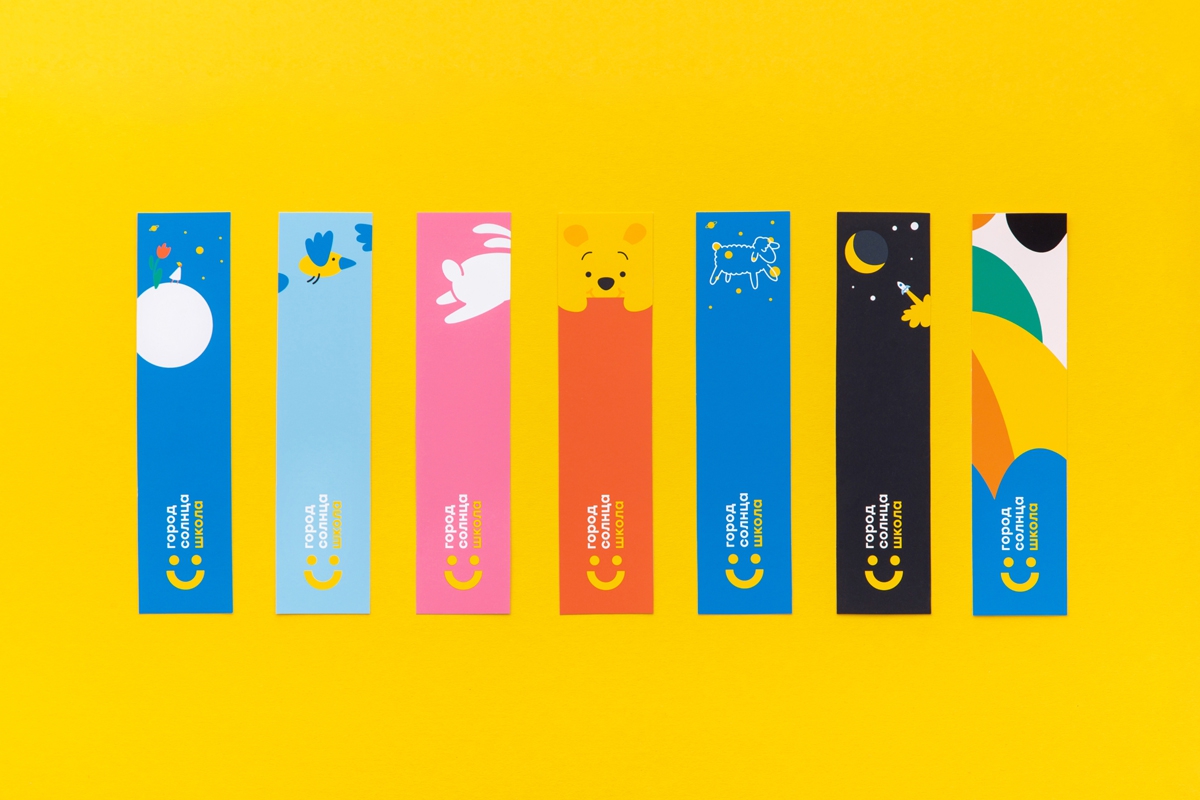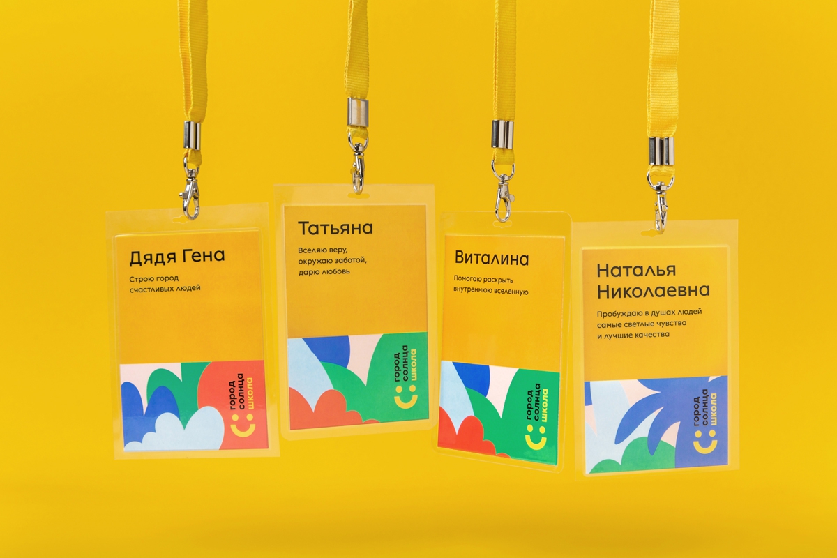 Айдентику «Города солнца» поддерживают авторские иллюстрации, вдохновленные миром детской фантазии, и особенный язык сообщений на постерах, где нет места дежурным фразам и стандартным конструкциям. На бейджах учителей вместо скучных должностей — миссии, на ручках дверей — колоритные хенгеры с приглашением войти или просьбой сохранять и поддерживать атмосферу урока.