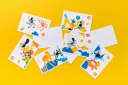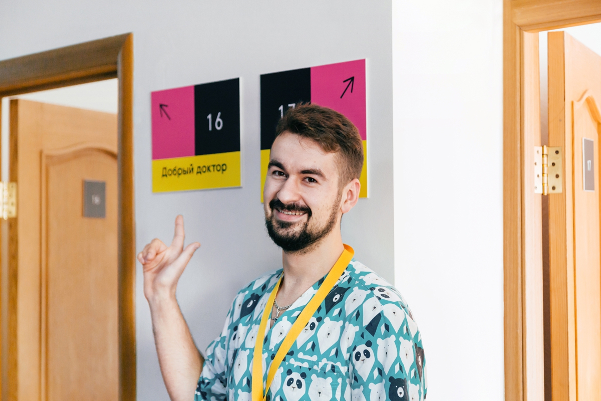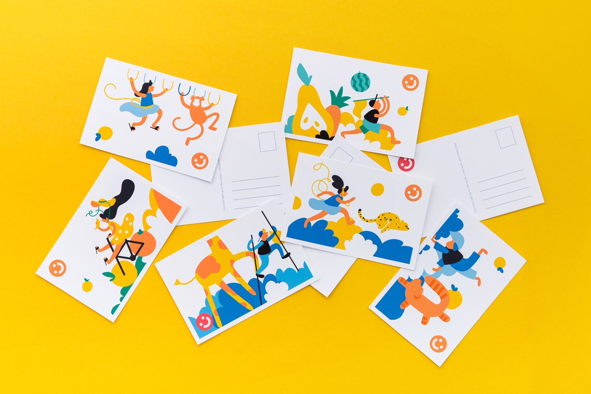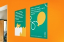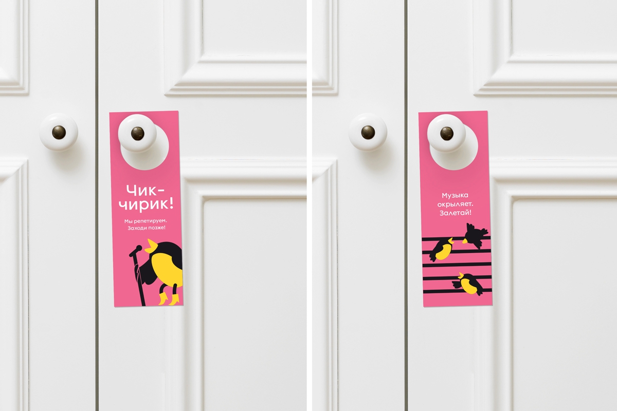 Айдентику «Города солнца» поддерживают авторские иллюстрации, вдохновленные миром детской фантазии, и особенный язык сообщений на постерах, где нет места дежурным фразам и стандартным конструкциям. На бейджах учителей вместо скучных должностей — миссии, на ручках дверей — колоритные хенгеры с приглашением войти или просьбой сохранять и поддерживать атмосферу урока.