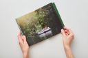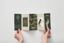 Фирменный стиль — это сдержанный зелёный и нежный бежевый цвета, а также природные текстуры и пейзажи.