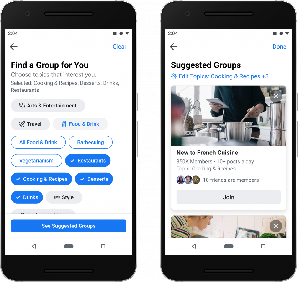 В целом в ленте новостей станет больше контента, опубликованного в группах, а разместить пост в сообществе можно будет непосредственно из хроники. Соцсеть полностью перекроила вкладку с группами, превратив ее в персонализированную ленту, где пользователь сможет следить за обновлениями в своих сообществах. Кроме того, новая система рекомендаций предложит ему потенциально интересные группы. Рекомендации также появятся во вкладках Marketplace, Игры, Facebook Watch и других.