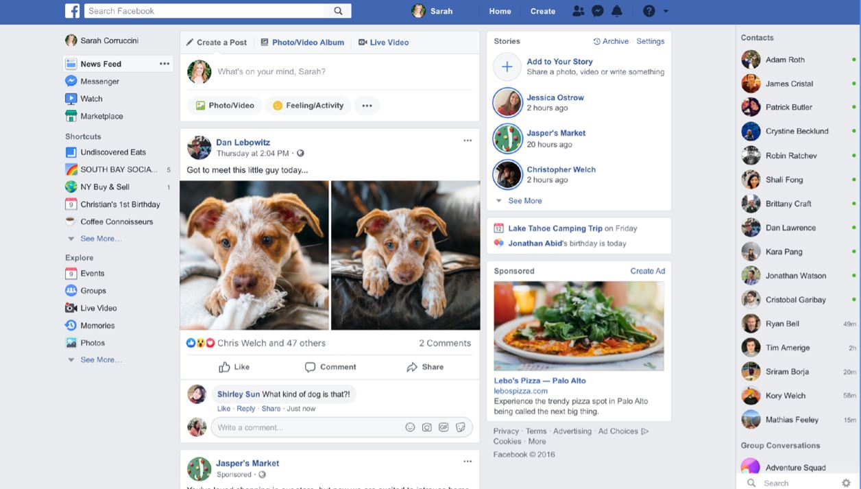 Дизайнеры обновили логотип Facebook образца 2013 года: теперь привычная белая f расположена не на синей квадратной подложке, а вписана в окружность голубого цвета. В десктопной версии больше «воздуха», белый цвет преобладает над синим, а вкладки мессенджера и групп соседствуют с видеосервисом Watch и разделом Marketplace. В последнем пользователь увидит подобранные специально товары и сможет оплатить их, не покидая соцсеть (пока такая возможность доступна только в США).