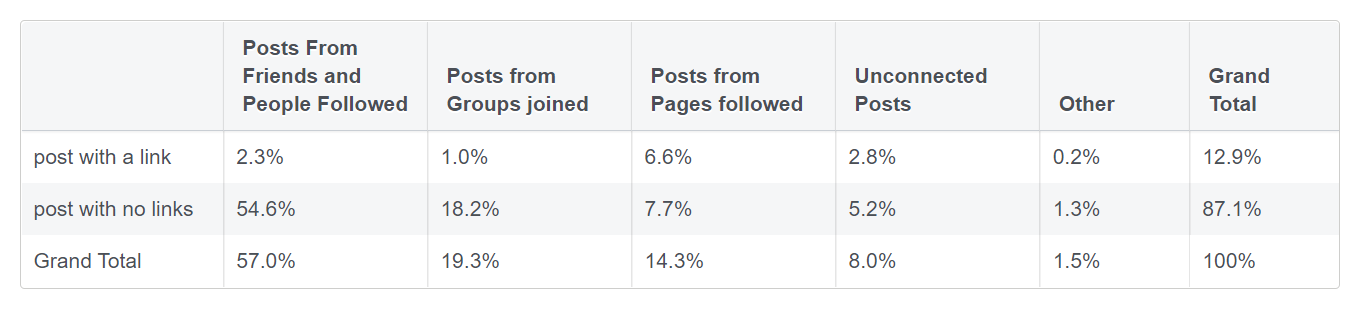 87,1% самого просматриваемого контента не содержит ссылок на внешние сайты. На посты со ссылками приходится всего 12,9%, большая часть которых опубликована на понравившихся страницах. Помимо ссылки посты могут одновременно содержать фото или видео.