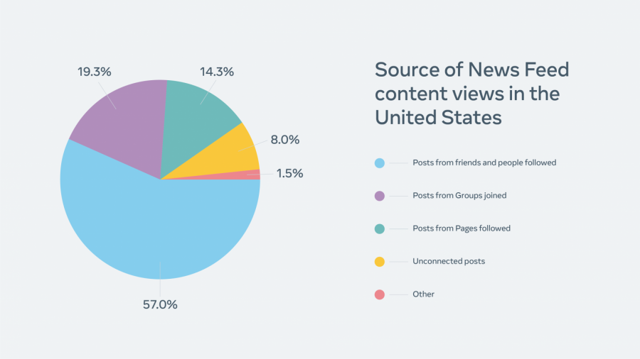 57% постов, которые видит пользователь, принадлежит его друзьям и людям, на которых он подписан. Долю в 19,3% занимает контент групп, 14,3% приходится на посты понравившихся страниц.