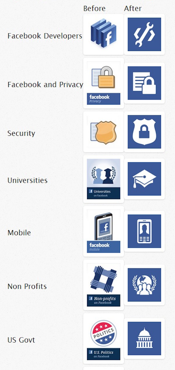 Логотипы некоторых официальных страниц на Facebook тоже претерпели ряд изменений, более очевидных, нежели логотип самой соцсети. Например, логотип страницы Sports on Facebook стал более лаконичным: вместо 12 изображенных на нем иконок с разными видами спорта теперь красуется только один символ – человек в движении. А логотип группы Facebook + Journalists избавили от нарисованной на нем телебашни, заменив ее символическим изображением карандаша на фоне листов бумаги.