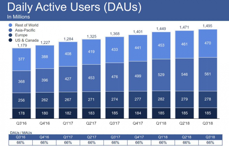 Согласно последнему квартальному отчету, в сентябре глобальная DAU соцсети составляла 1,49 млрд человек. Из них 185 млн приходится на США и Канаду, 278 млн — на Европу, 561 млн — на Азиатско-Тихоокеанский регион и 470 млн — на остальные рынки. Ранее отдельной статистики по России компания не раскрывала. Последние два года соотношение глобальной суточной аудитории к месячной (DAUs/MAUs) не изменяется и составляет 66%.