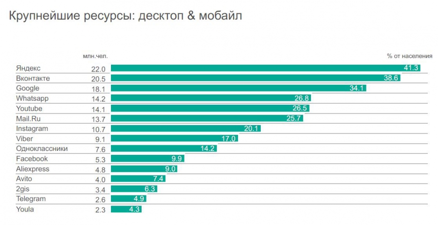 По данным «Яндекс.Радар» за сентябрь 2018 года, Facebook является четвертой по популярности соцсетью в России с месячной аудиторией 53,5 млн человек (кросс-девайсная — 35,1 млн человек). При этом она уступает своей дочерней платформе Instagram, которая привлекает 78,2 млн российских пользователей в месяц.
