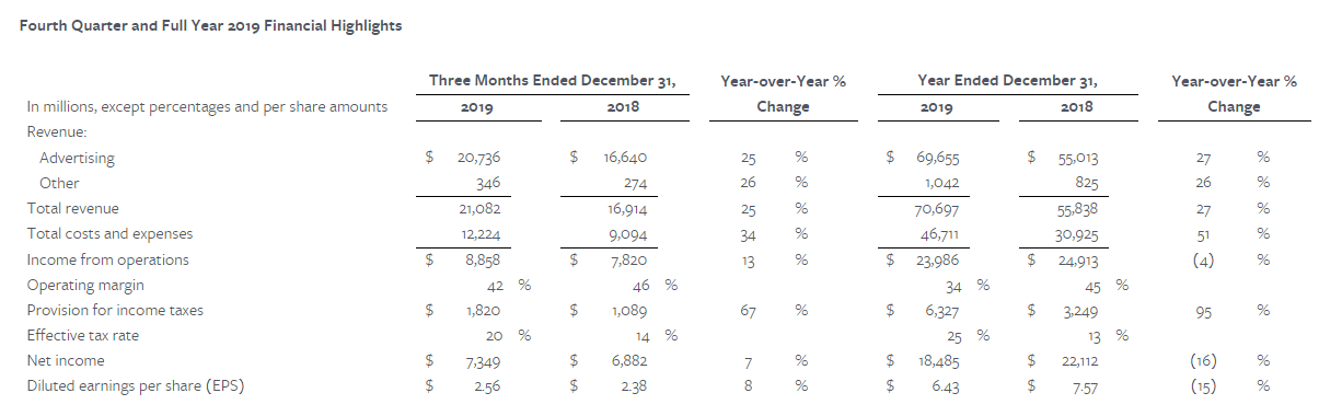 Выручка Facebook в 2019 году выросла на 27% до $70,7 млрд, из них $69,6 млрд — это рекламная выручка, сообщается в отчете компании.