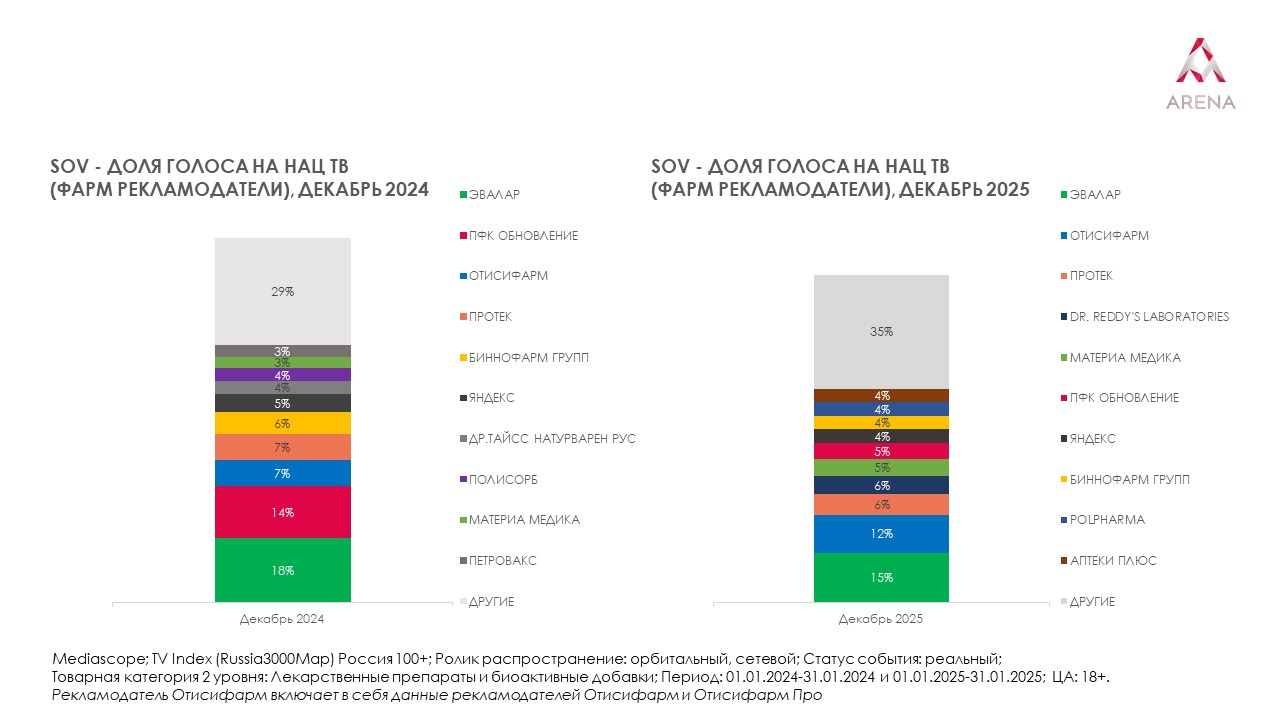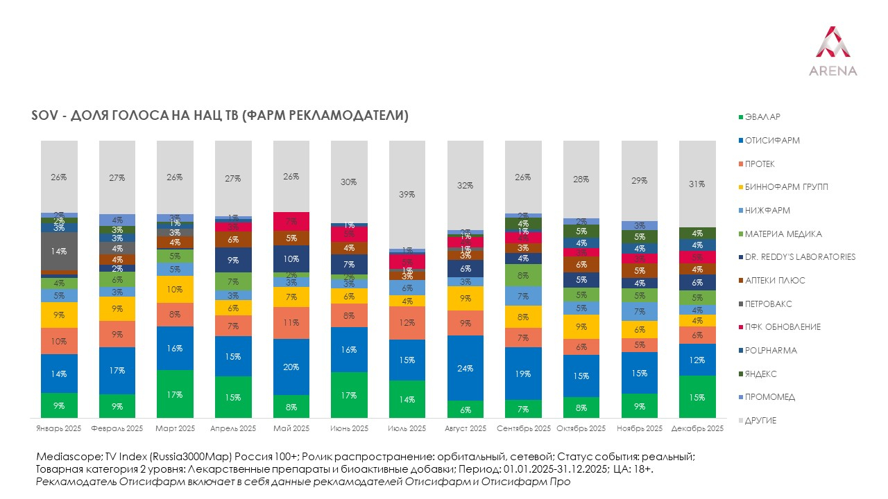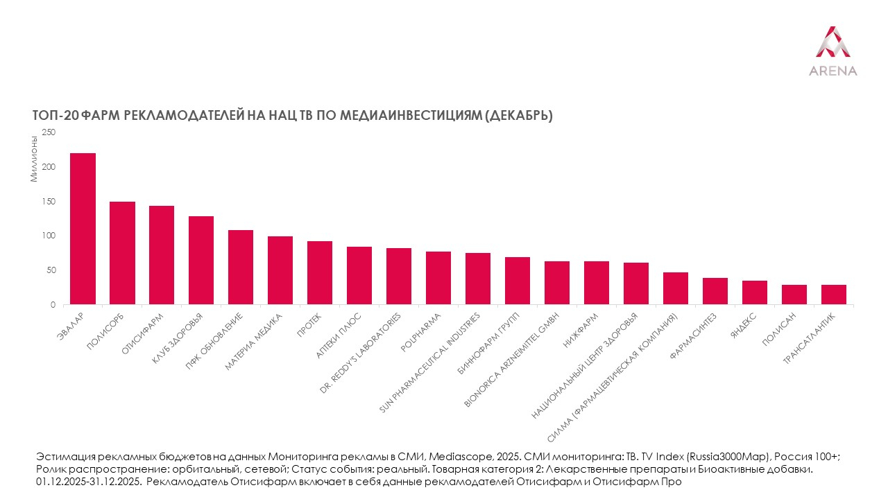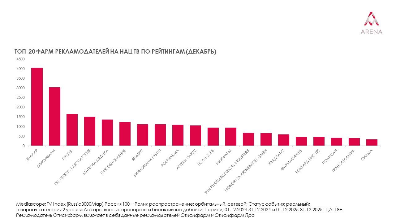 По итогам декабря 2025 года первое место среди всех рекламодателей в указанной категории занял «Эвалар». На второй строчке «Отисифарм», на третьей — «Протек». Пятерку крупнейших рекламодателей замыкают Dr. Reddy's Laboratories и «Материа Медика». Игроки второго эшелона стремятся укреплять позиции и активнее бороться за внимание аудитории, даже в условиях высокой конкуренции на рекламном рынке. Среди иностранных игроков в рейтинге представлены Sun pharmaceutical industries, Unipharm и «Зентива Фарма».