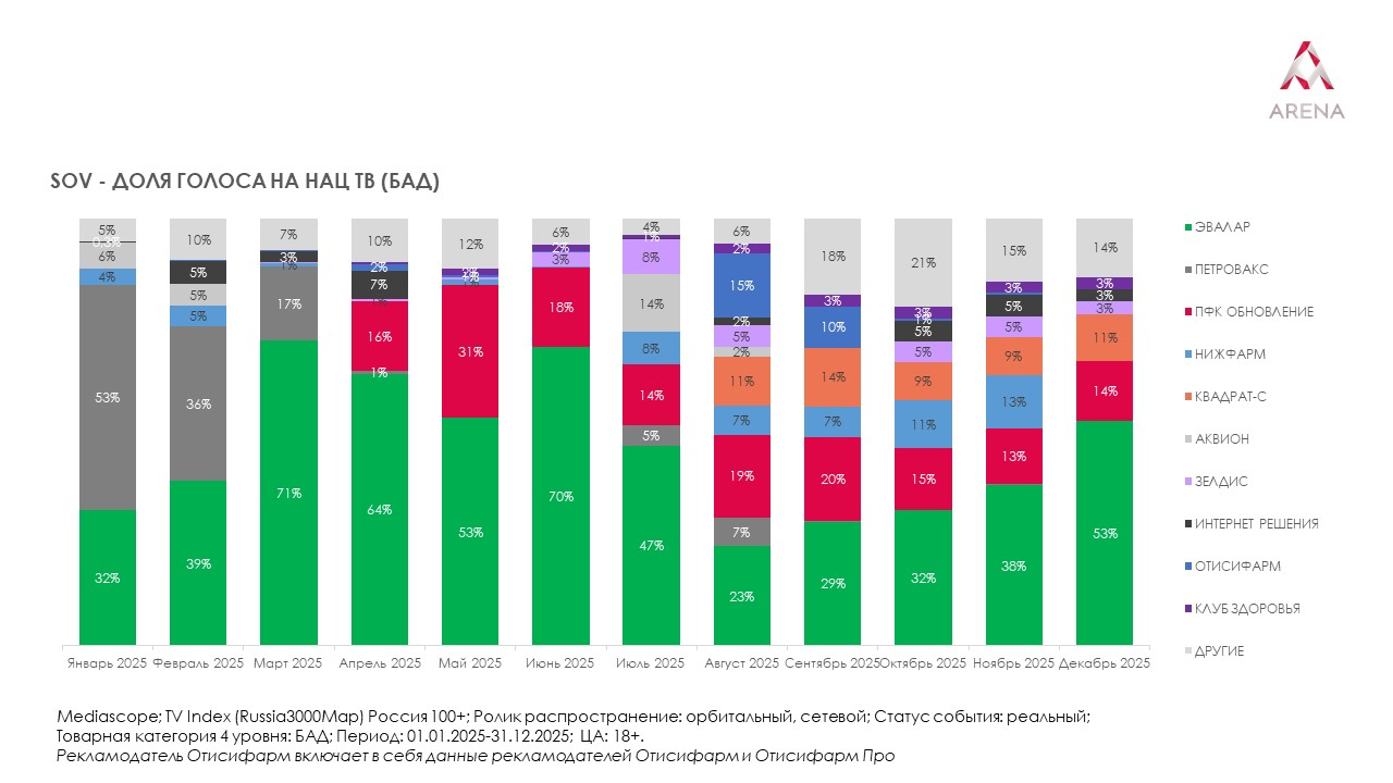 Активность производителей БАДов на федеральном ТВ оставалась высокой в 2025 году. Крупнейшим рекламодателем в этой подкатегории стал «Эвалар» (объем ТВ-рекламы компании по итогам прошлого года составил 31 671 пункт TVR, доля рынка — 44%). На второй строчке «Петровакс» (10 819 пунктов TVR и доля рынка в размере 15%), на третьей — «ПФК Обновление» (7 474 пункта TVR и 10%-ная доля).