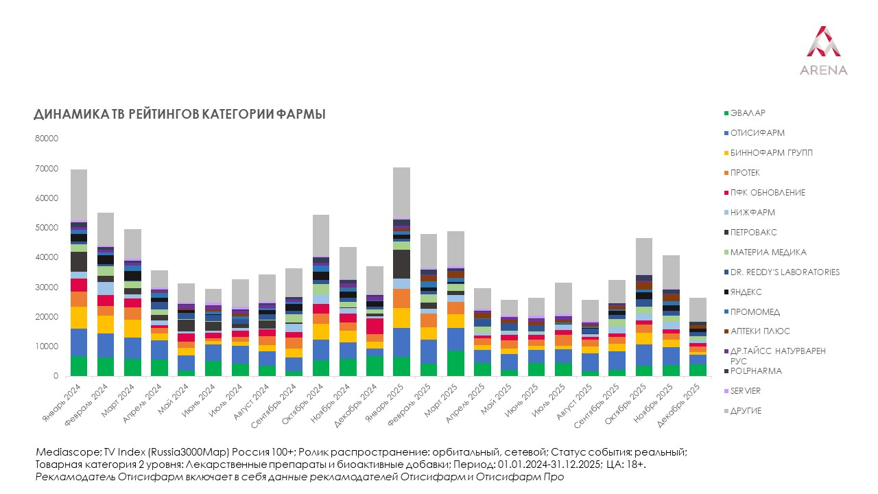На российском рынке телевизионной рекламы в категории «Лекарственные препараты и БАДы» в 2025 году наблюдалось перераспределение сил и укрепление позиций отечественных игроков. Весь топ рекламодателей заняли российские компании. Доля иностранных рекламодателей на ТВ составила 12%, а совокупный TVR (телевизионный рейтинг) — 44 886. Таковы данные исследования, проведенного