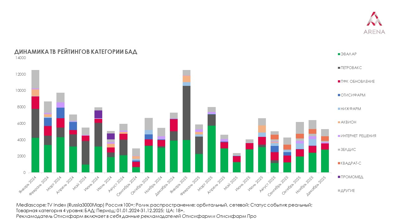 В декабре продажи брендированных БАДов выросли на 13,9%, до 13,556 млрд руб. ТВ-рейтинг категории в том же месяце показал ожидаемую корректировку, что подтверждает ключевой вывод: телевидение продолжает работать на долгосрочный эффект, формируя узнаваемость и доверие к бренду, тогда как рост розничных продаж зависит от более широкого набора инструментов.