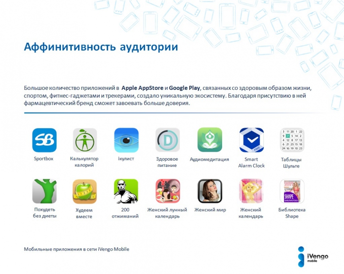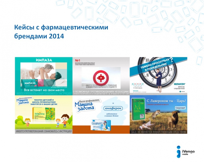 В мобильной рекламной сети iVengo Mobile были проведены рекламные кампании для таких фармацевтических брендов, как Materia Medica, Ниармедик, UNIPHARM, Nillen Alliance Group.