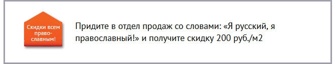 Спорная реклама предлагала «скидки русским и православным». Чтобы получить квадратный метр на 200 рублей дешевле, покупателю необходимо было прийти в отдел продаж и произнести фразу «Я русский, я православный!»