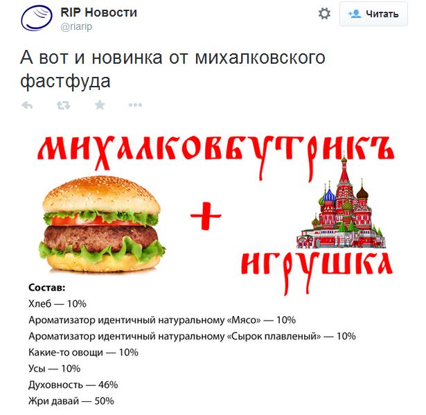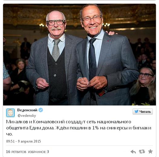 Идея Кончаловского и Михалкова создать сеть общепита «Едим дома!» взбудоражила интернет. Пользователи активно выдвигают версии, на что можно попросить у президента Владимира Путина миллиард рублей. Варианты самые разные — от «открытия холодильника» и запуска патриотических парикмахерских до создания собственного Playboy.