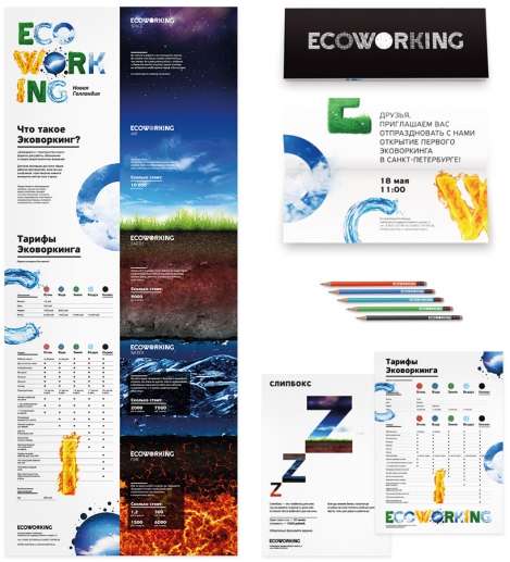 В Эковоркинге существует пять тарифов расчета оплаты: четыре стихии Земли и непокоренный космос. Креаторы Fastway попытались отобразить этот принцип в логотипе и фирменном стиле.