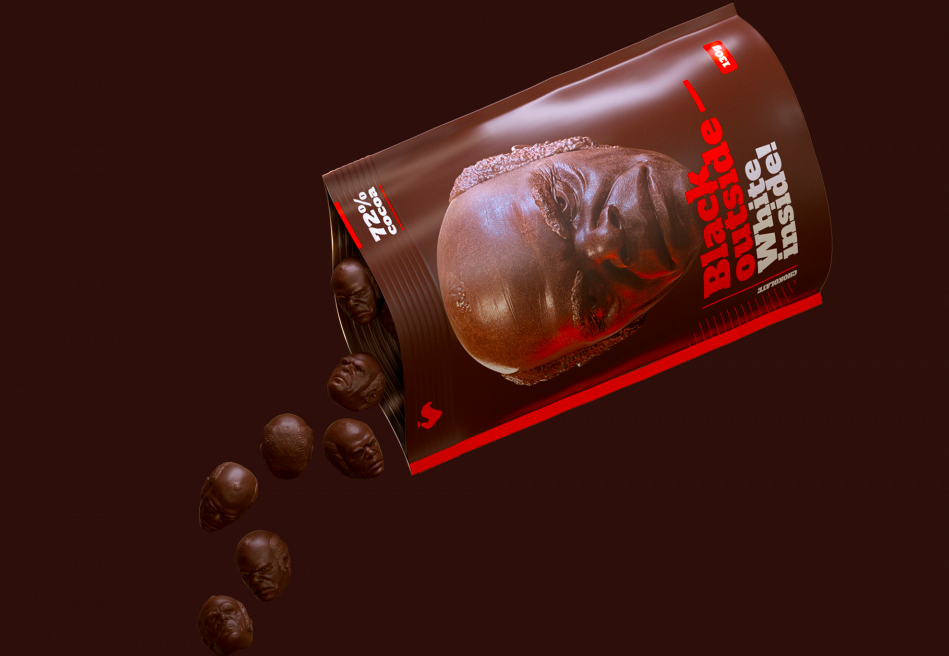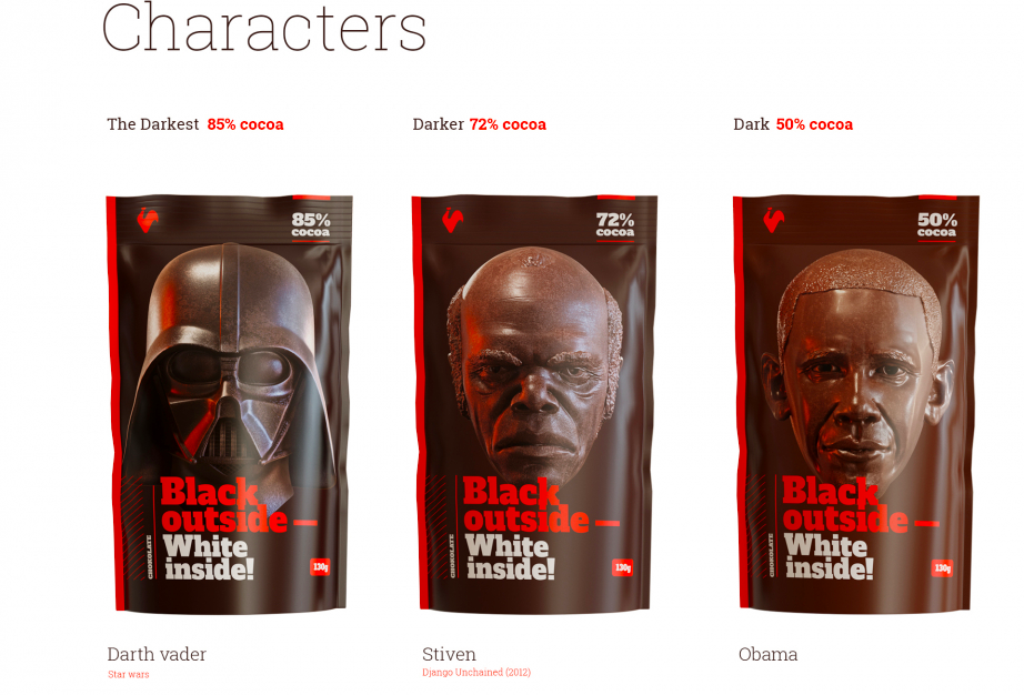 Дизайнер провел метафору от этой специфики шоколада к теме цвета кожи, затем тщательно отобрал известные образы, чья биография наиболее остро связанна с этой темой.