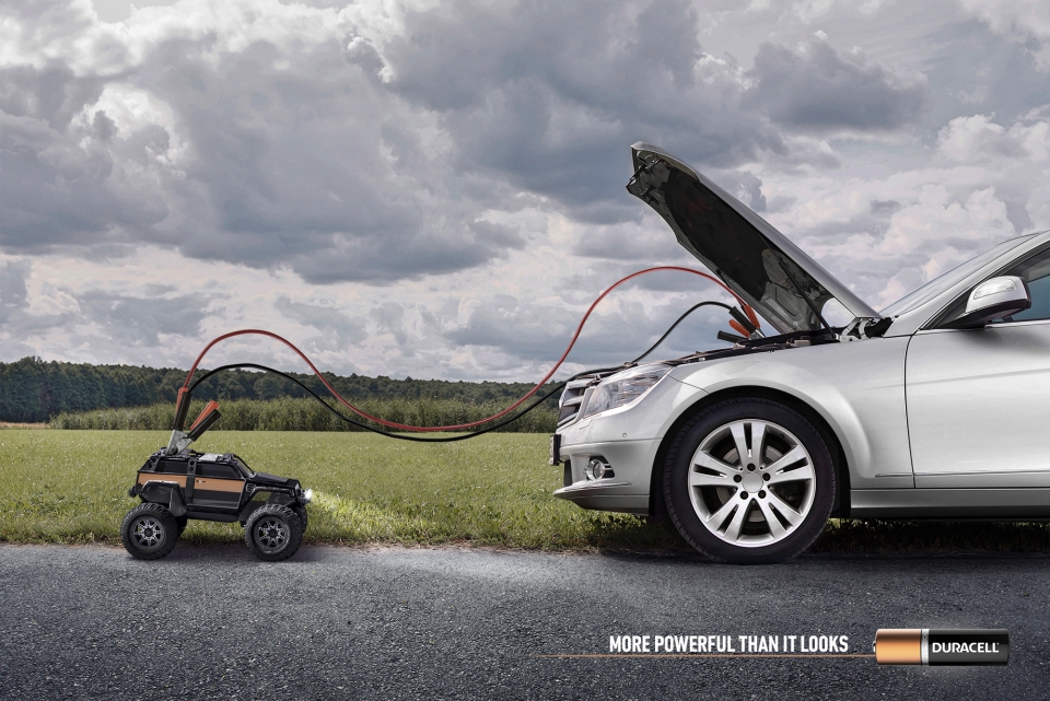 Гиперболизированный принт о том, что батарейки Durasell гораздо мощнее, чем кажутся на первый взгляд.