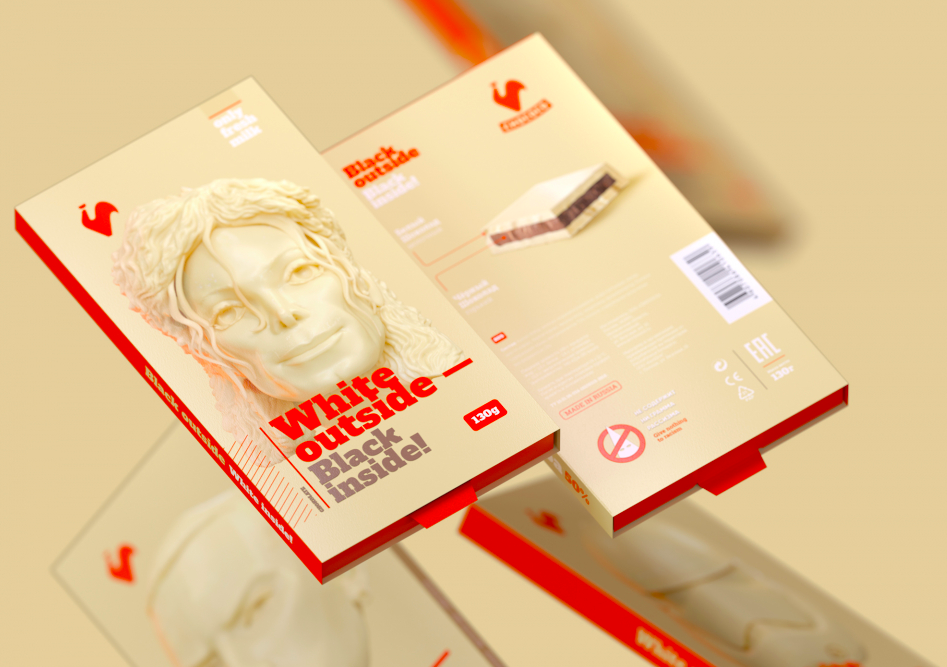 Проект представляет собой серию упаковки шоколада. Идея базируется на специфике конструкции шоколада: Снаружи — чёрный, внутри — белый, и наоборот.
