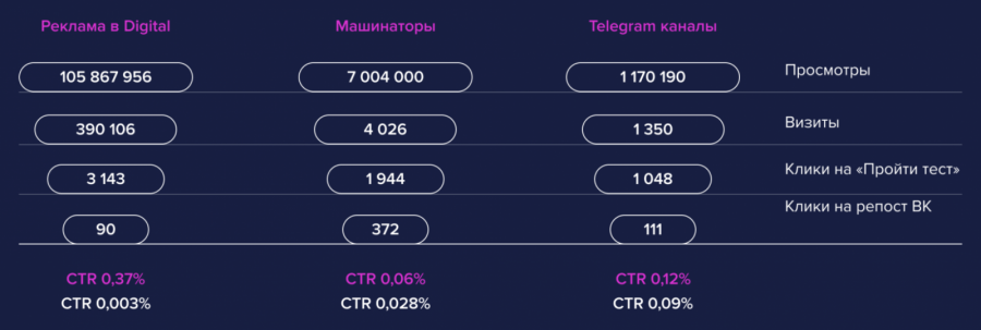 Всего по итогам диджитал-размещений нам удалось охватить около 40 млн пользователей и привести на сайт почти 400 тыс. человек. Тест на сайте прошли 3,3 тыс. пользователей, а выполнили все условия конкурса — прошли тест, репостнули его результаты на страницу «ВКонтакте» и подписались на сообщество бренда — около 700. С точки зрения конверсии, лучше всего показали себя посевы в Telegram-каналах автоблогеров.
