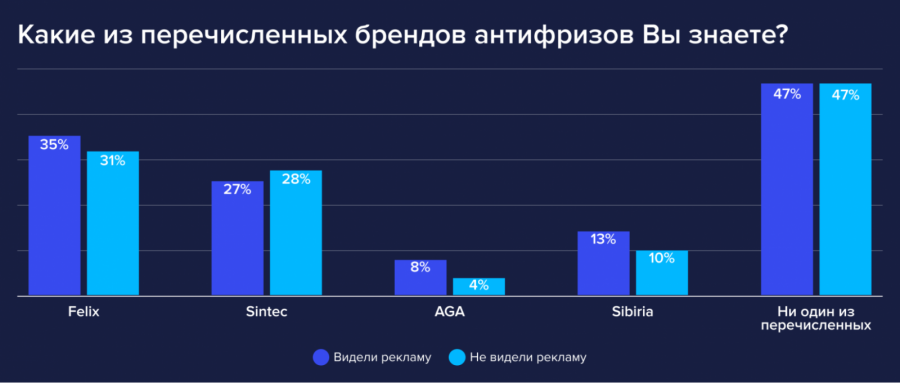 Отвечая на вопрос «какие бренды антифриза вы знаете?», пользователи чаще других называли Felix — 35% ответов. При этом мы видим прирост узнаваемости среди группы видевших наружную рекламу проекта «Felix Тест-драйв».