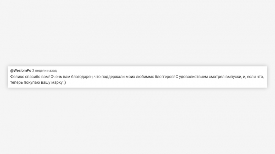 Лояльность аудитории. Спецпроект отличился большим перевесом положительных комментариев. Доля позитива в отношении проекта в целом превысила 76%, а доля хороших откликов с упоминанием бренда Felix — 49%. Комментаторы благодарили Felix за спонсорство любимого канала, розыгрыш и познавательную рекламу. Также они отмечали качество продукта.