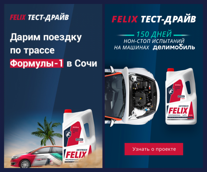 - Блогер выпускает первый ролик, где делает обкат и первичный обзор испытуемых машин, чтобы показать их изначальное состояние. Далее заливаем в каждый автомобиль антифриз Felix.